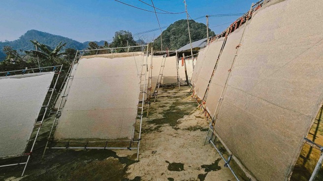 Khâu cuối cùng là tráng giấy. Đây là khâu khá khó vì đòi hỏi người tráng phải có kinh nghiệm tráng đều trên khung màn đóng sẵn. Người H’Mông đặt ngang chiếc khung vải, dùng muôi múc bột giấy dàn đều trên mặt vải, rồi cầm khung lắc qua lắc lại cho thật đều.