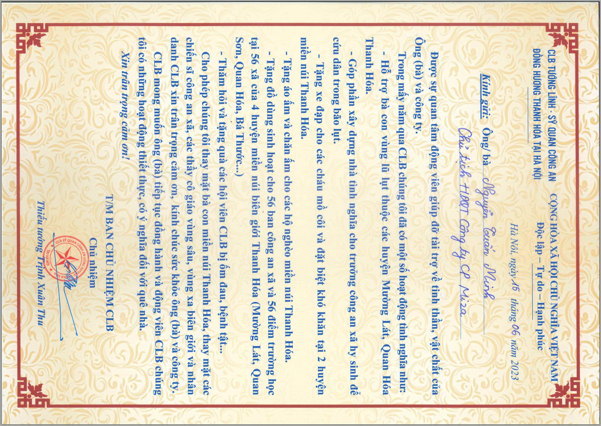 Như thông lệ hàng năm, với mục đích hướng tới ngày Truyền thống Lực lượng Công an Nhân dân 19/8, Công ty cổ phần Miza tiếp tục đồng hành cùng Câu lạc bộ Tướng lĩnh sĩ quan Công an đồng hương Thanh Hóa tại Hà Nội thăm và tặng quà cho bà con, nhân dân và chiến sĩ có điều kiện làm việc và sinh hoạt khó khăn thiếu thốn tại các tỉnh miền núi, vùng sâu, vùng xa biên giới của Tỉnh Thanh Hóa.